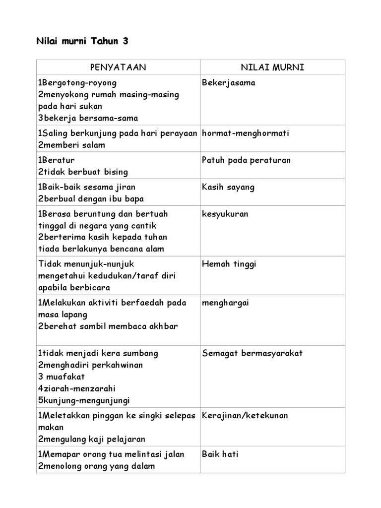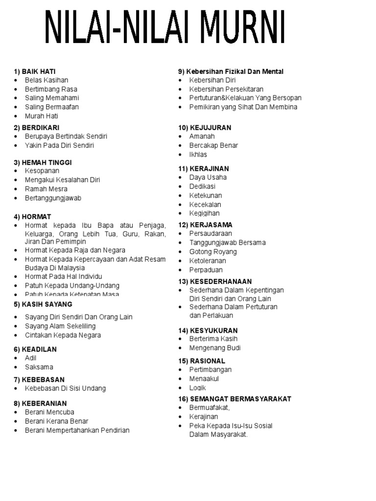 Kempen dalam memupuk kesedaran mengenai nilai murni ini sangat penting kerana masyarakat hari ini sudah mula melupakannya. At this level, she will be tested for the meaning of each nilai murni. 70% (10) 70% found this document useful (10 votes) 60k views 3 pages. Powerpoint nilai murni by sannykerk 6106 views. Nilai murni slot 2 by ila731126_016470: